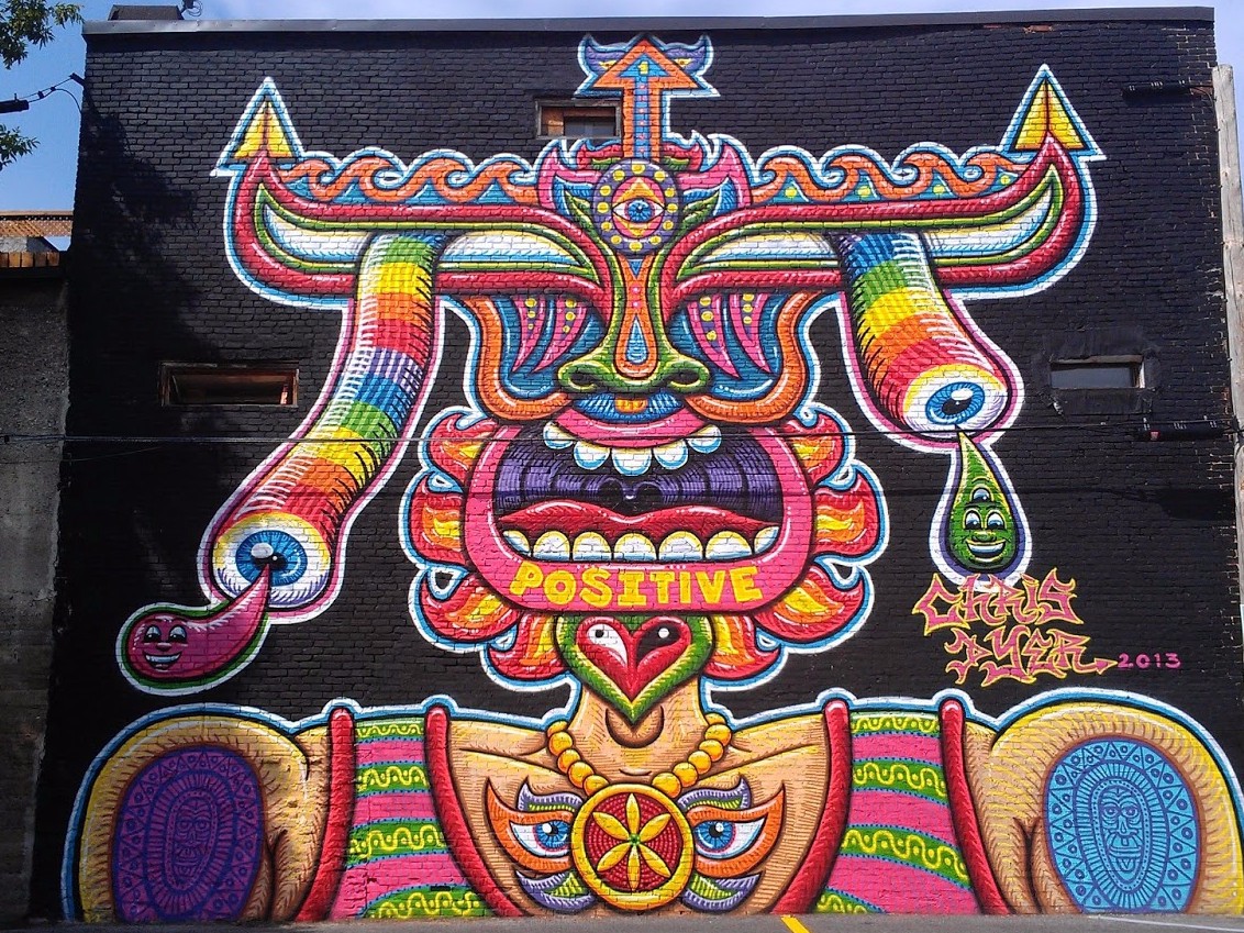 “Eu evitei pintar murais no início, porque apesar de ser uma das primeiras coisas que chamou a minha atenção, meu irmão fazia grafiti e não queria entrar nesse lance de competição. Na época, em Montreal não tinha uma cena de skate art nem de de arte visionário…todos meus amigos faziam spray painting, então acabei experimentando. Me apaixonei e agora sou viciado! Porém, não me considero só um artista urbano, mas esse meio permite me expressar rapidamente em superfícies grandes e bonitas”- Declarações do Cris para The Creators Project, citadas em Creator Vis, depois de ser convocado para pintar no Ometeotl Festival 2016, no México.