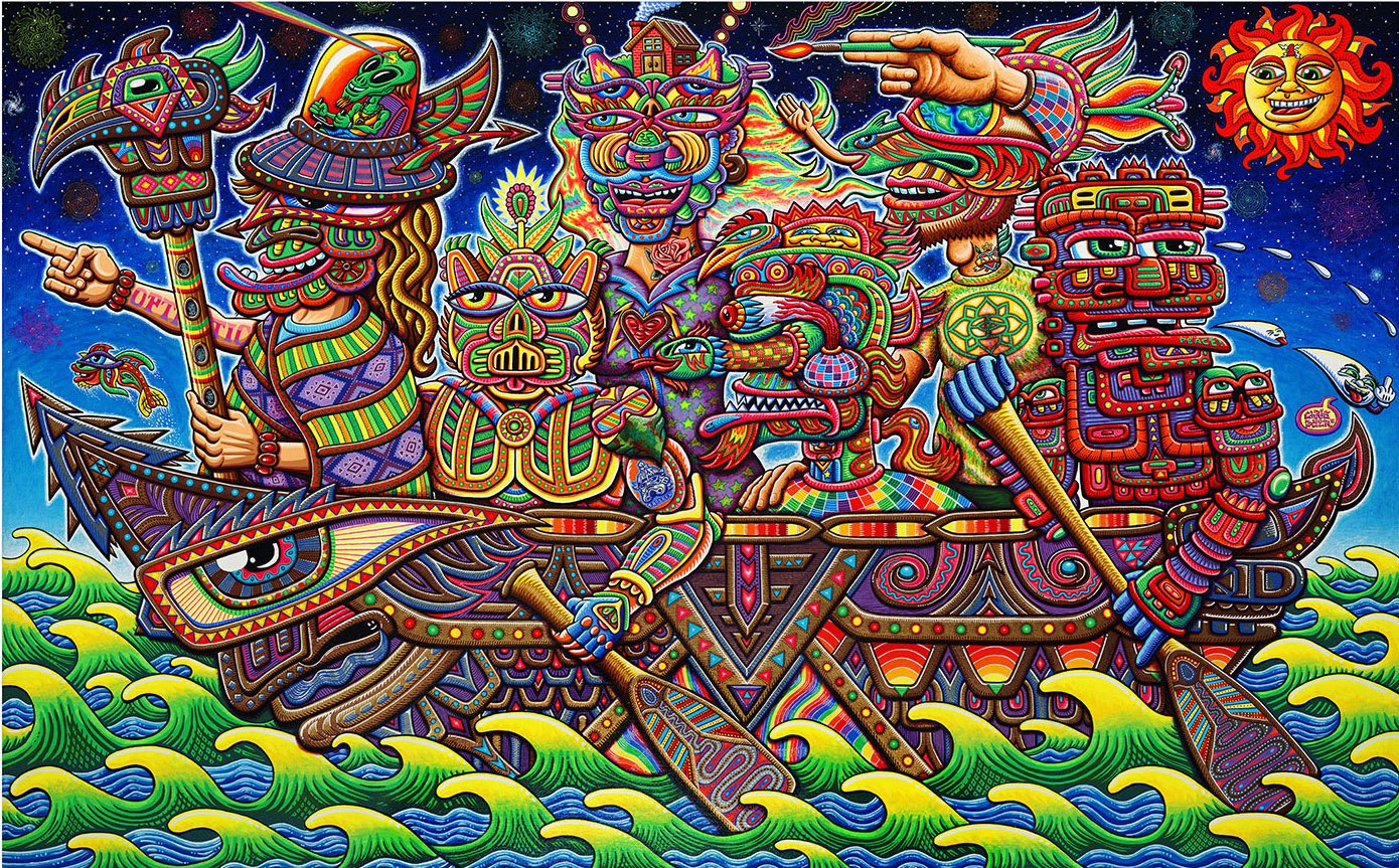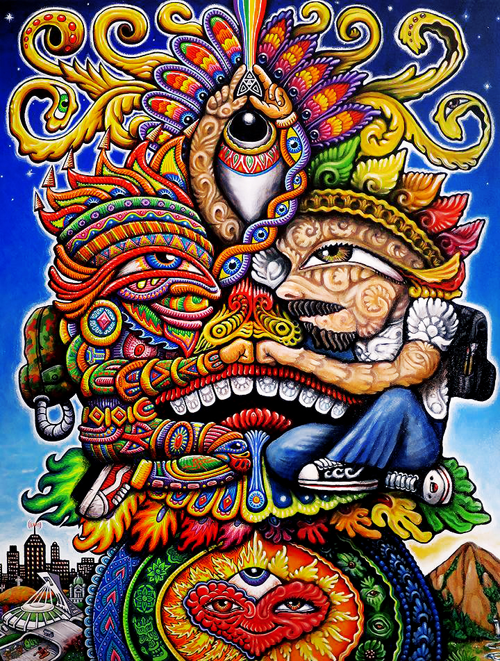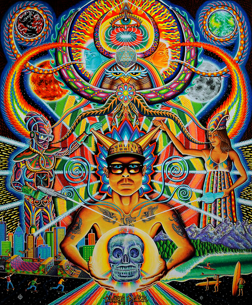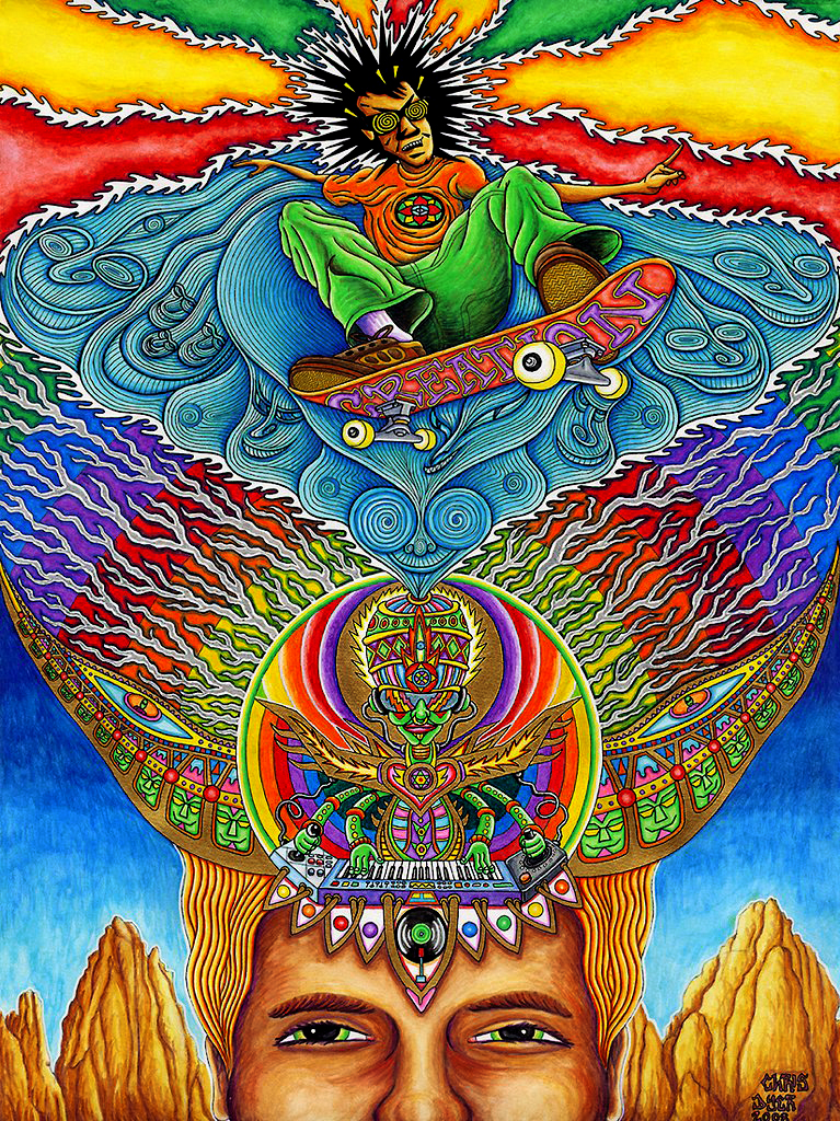 Chris Dyer é um dos nomes que ressoa forte quando o papo é sobre a nova geração de artistas visionários. Sua arte se caracteriza por desenhos vibrantes com componentes espirituais e lembranças de culturas ancestrais, que se misturam com elementos urbanos, relativos ao skating e ao surfing. Essa inesperada fusão, é a marca registrada do artista canadense, quem consegue colocar um toque divertido e descontraído, contrastando com o ar de solenidade que normalmente recobre a maioria das obras psicodélicas que vemos por aí.