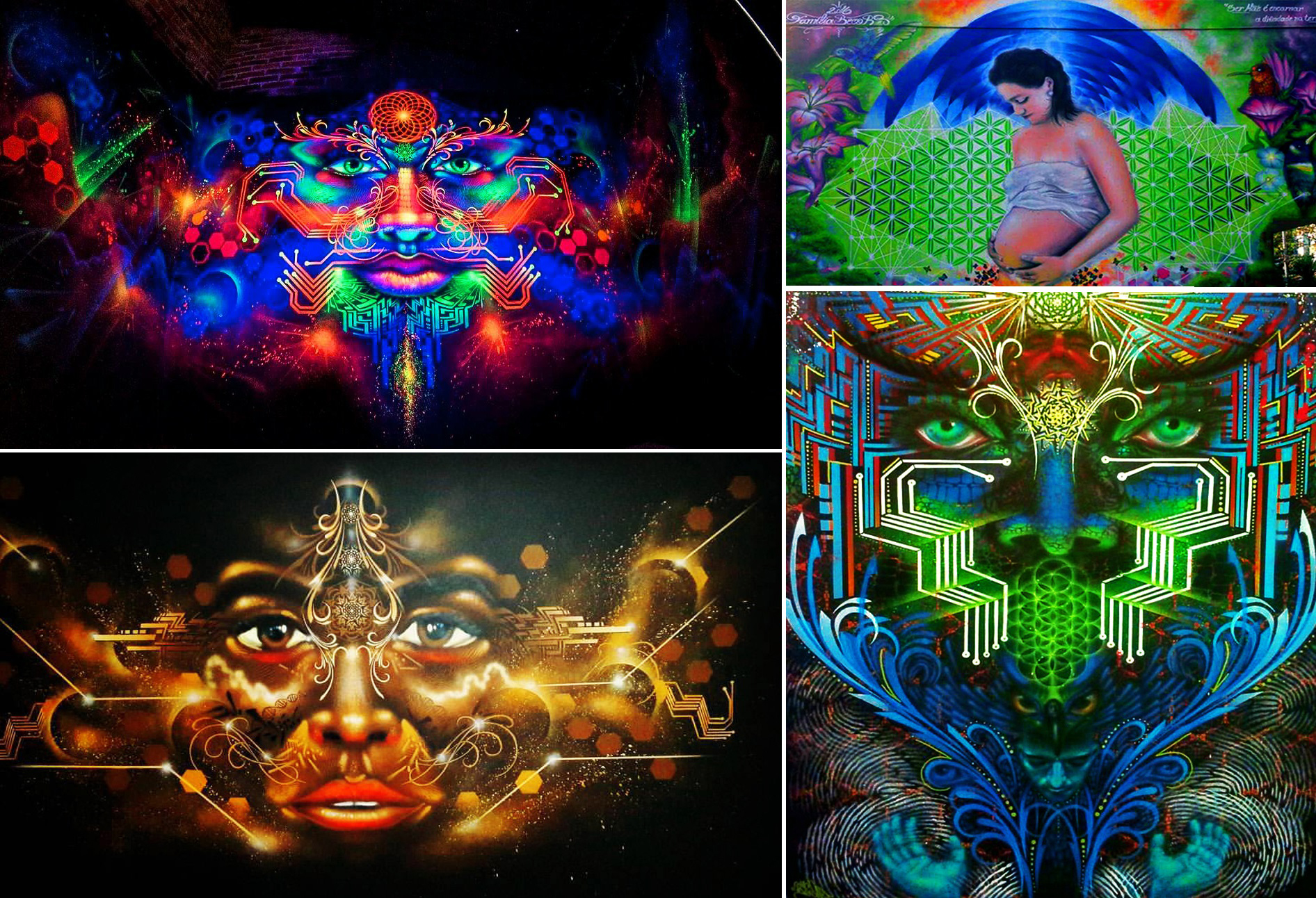R.M: Sempre tive facilidade com desenho desde pequen, faço parte da segunda geração de grafiteiros do estado, vivenciei a evolução dos materiais e meios de comunicação virtual. Comecei a frequentar festas eletrônicas em 2004 em Porto Alegre e em 2008 foi meu auge de frequência nas festas… o sonho de querer conhecer o UP era grande. Fiz a viagem mas ao mesmo tempo passei bastante dificuldade por não estar bem preparado para ela. A partir daí foi um divisor de água muito importante na minha vida, pois nessa viagem resolvi parar de frequentar o rolé. Então retornei para as minhas raízes, que é o graffiti, foquei nele, mas com um estilo de trabalho novo, que tinha mudado pela experiência visual vivida durante esse tempo no psytrance.