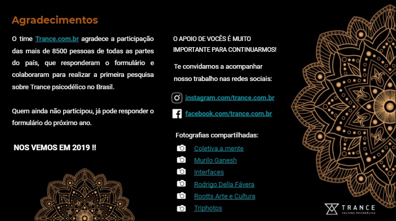 No próximo ano, vamos lançar uma versão estendida e comparativa do Mapa do Trance no Brasil. Se você gostou dessa pesquisa e está curioso/a por saber como vai ficar a próxima versão, aproveite para já se inscrever na coleta de dados de 2020, clickando AQUI. Nos comprometemos a entrar em contato e te enviar a entrevista. Obrigado por tirar 3 minutinhos do seu tempo e representar a sua individualidade no ecossistema nacional! 😉