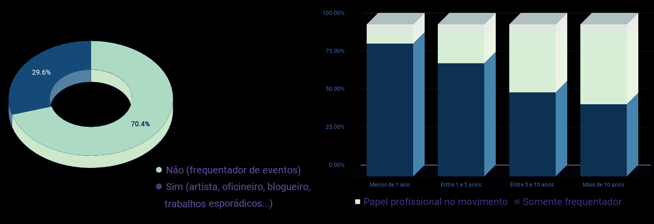 Gráficos tirados do Mapa do Trance 2018. Esquerda: Porcentagem de envolvidos profissionalmente no movimento (%) | Direita: Relação entre o tempo dentro do movimento e o papel na cena (%){ Se ainda não sabe o que é Mapa do Trance 2018,