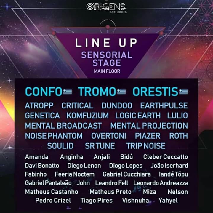 É claro que a vinda dos gregos Confo, Tromo e Orestis, foi muito aclamada pelos amantes do som noturno! Porém a produção pontualiza que a pista do Origens Gathering celebrará todas as vertentes do Trance, respeitando um aumento progressivo das bpm conforme avança a noite. Aquele esquema que já a gente já conhece: a vibe do Psychedelic e do Progressive animará a pista durante a metade da manhã até o fim de tarde, e a bruxaria chegará junto com a noite, acelerando do Dark, do Forest até o Hitech, já nas primeiras horas da manhã.