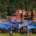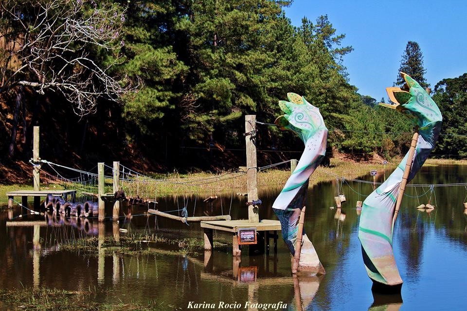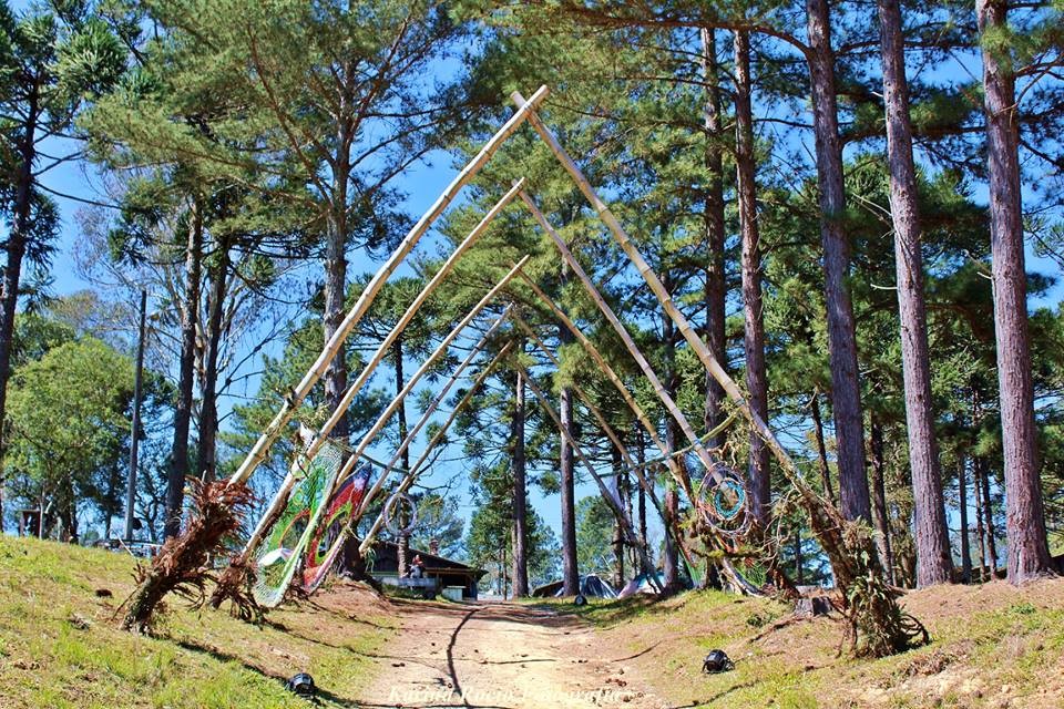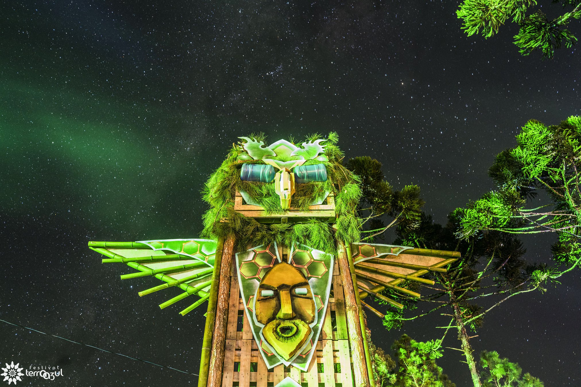 Logo após o portal, em meio das araucárias, havia uma escultura gigantesca construída de bioconstrução com o uso de materiais como pallets, garrafões de água, vegetação e bambu:
