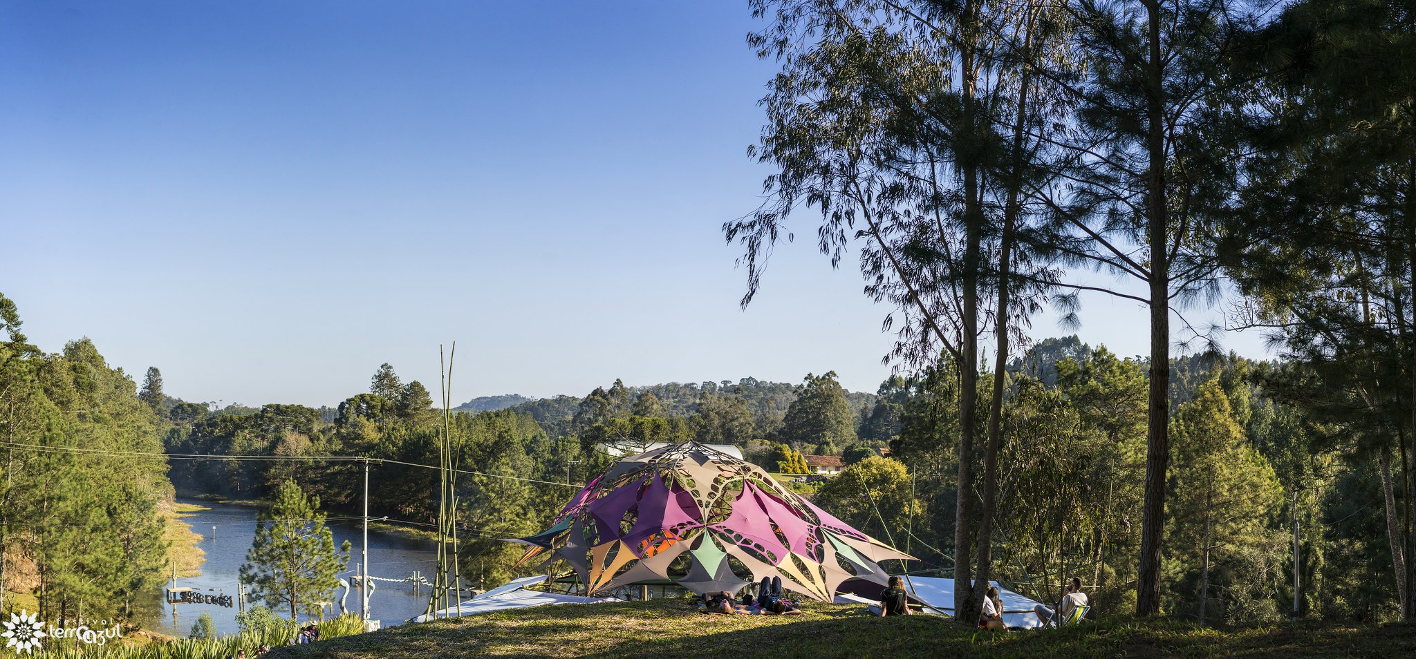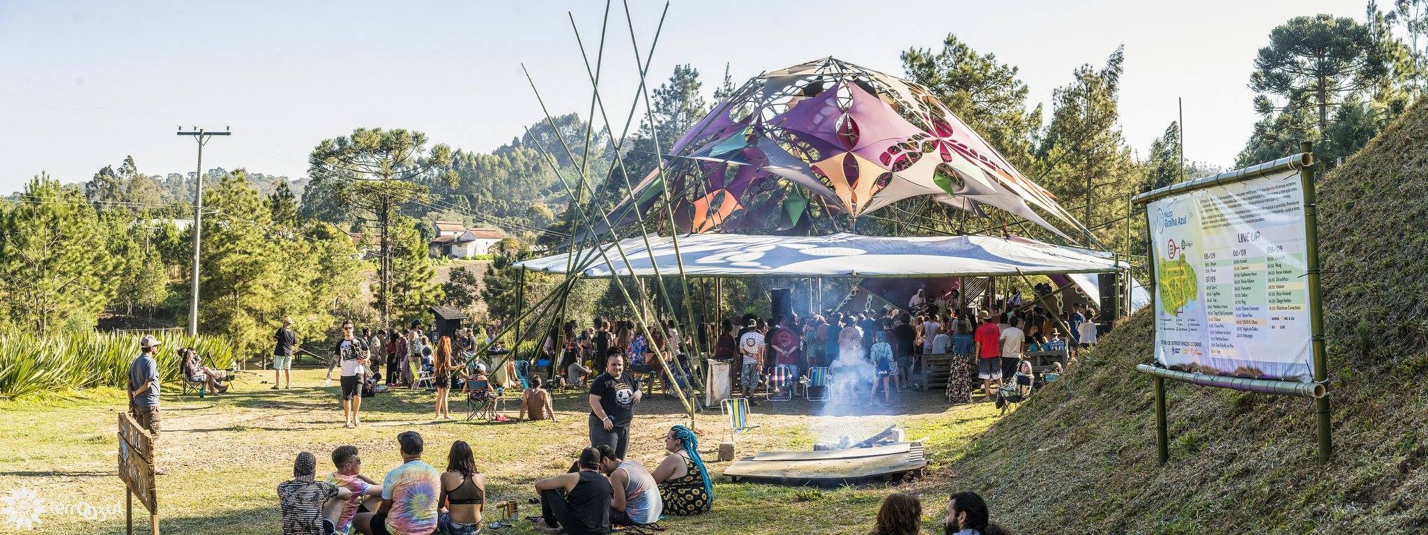 A tenda foi montada em bioconstrução pela equipe Arte Astral, em tons de roxo, azul e verde.