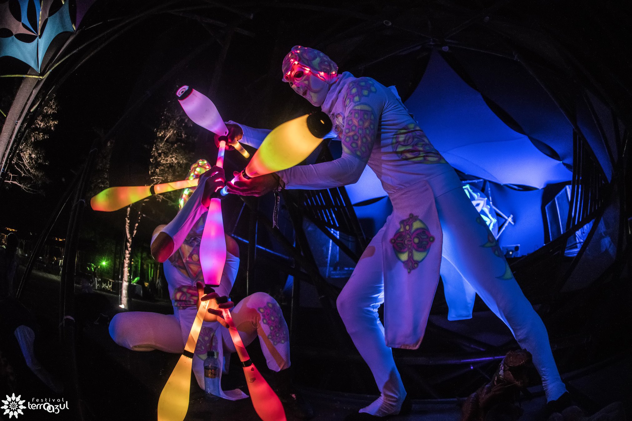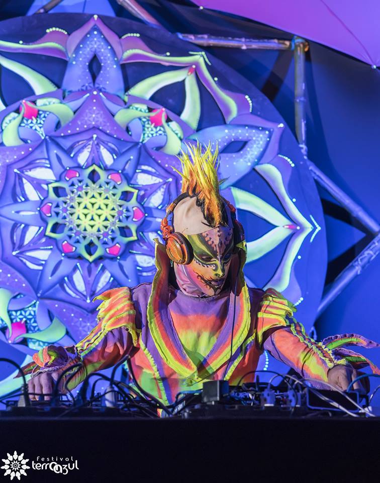 Na sequência fomos surpreendidos por algo que eu nunca havia presenciado: Kyran Ashram, o artista que encenava a intervenção artística de malabares em cima do palco, assumiu as CDJs após a performance, juntamente com o grupo Circoloko Alucinações e a sonzeira comeu solta! O projeto se chama Allientech e foi de tirar o chapéu! Ótima junção de arte com psicodelia!