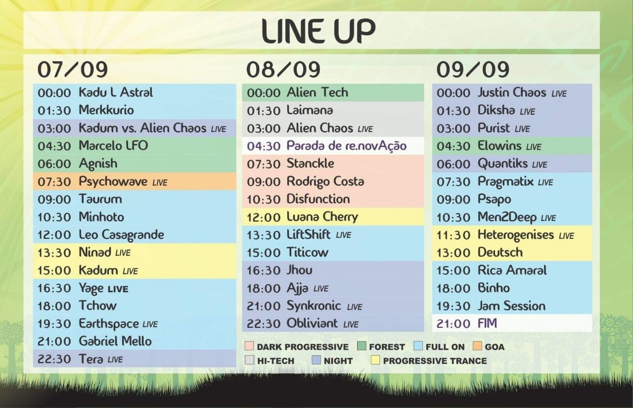 O line-up do palco principal contou com 43 apresentações, sendo 24 DJ Sets e 19 lives distribuídos em 26h de Full on, 15h de Night, 8h de Progressive, 6h de Forest, 4:30h de Dark Progressive e 1h de Goa.