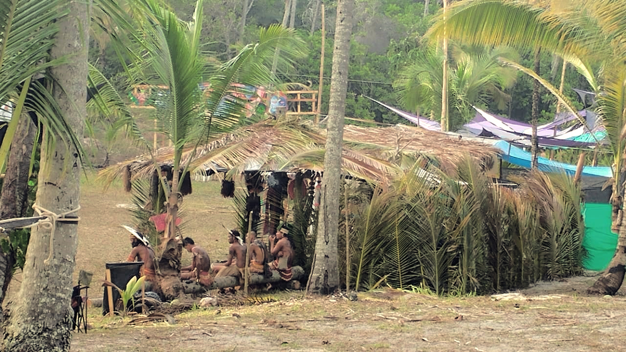Fomos despejados (e já aproveito para parabenizar o pessoal da segurança, que foram queridos com a gente durante todo o evento) e pouco depois de realocar nossa barraca, os índios Pataxô botaram mãos à obra. Com grande destreza, rapidamente a estrutura esteve pronta: uma bela sombra de folhas sustentada por bambus, para ser usada como “cabine” de salva-vidas.